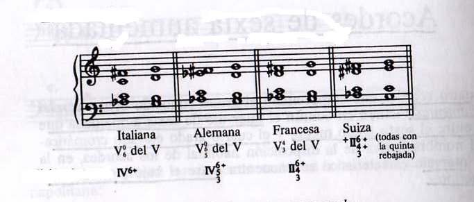 Son cuatro los acordes que forman el grupo conocido como acordes de sexta aumentada: Sexta Italiana, Sexta Alemana, Sexta Francesa, y Sexta Suiza. Todos ellos forman un intervalo de sexta aumentada entre la voz del bajo y otra de las voces superiores del acorde. Intervalo de sexta aumentada que se forma entre el sexto grado menor y el cuarto grado elevado cromáticamente.